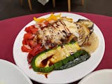 Chopped rosemary chicken, grilled vegetables (eggplant, zucchini, onion, yellow, and red bell peppers) with shaved parmigiano reggiano and an aged balsamic vinegar drizzle. Does not include 2 side orders.